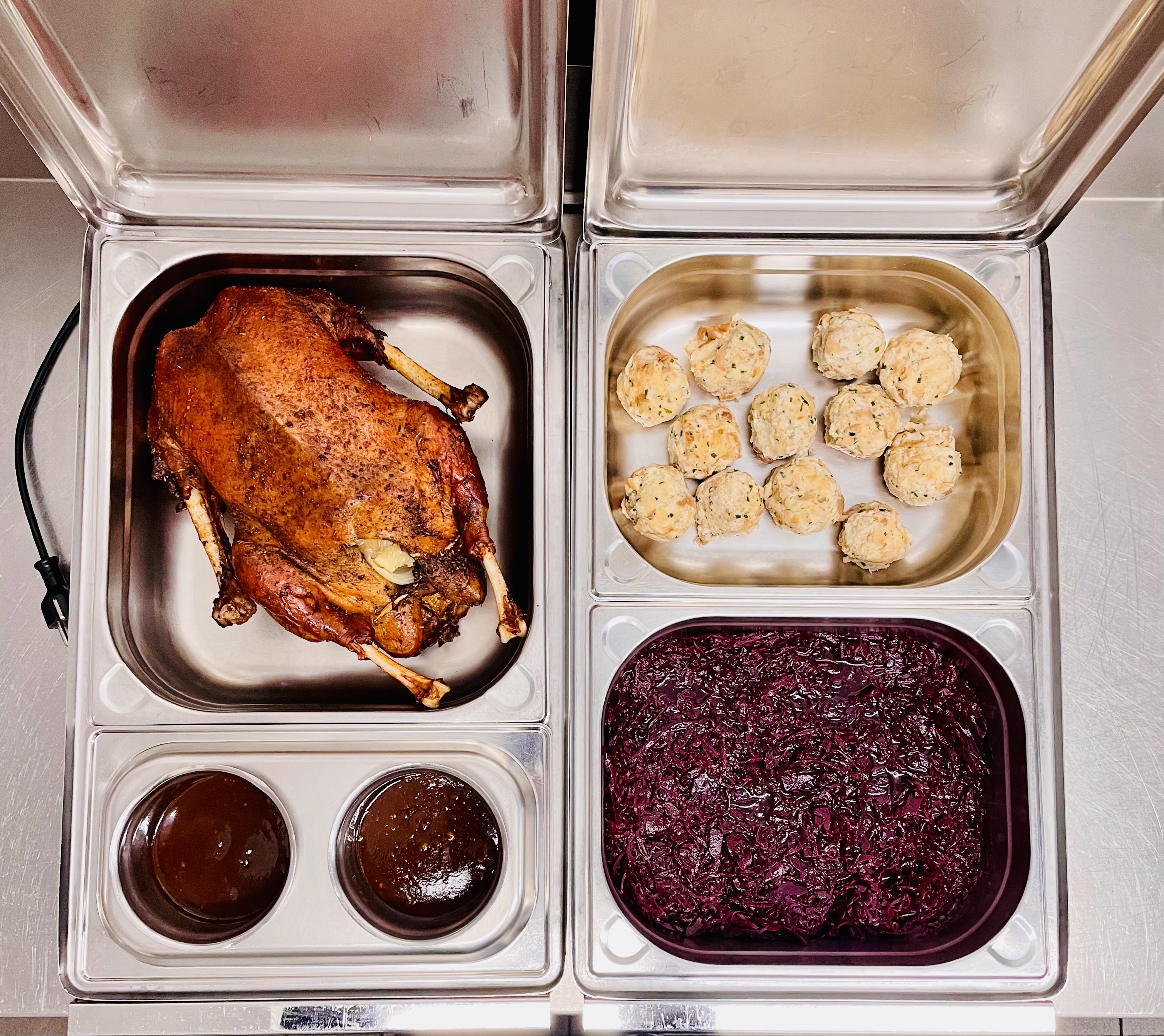 Ein elektrisches Warmhaltegefäß von WMF hält Ihre bestellte Gans und die Beilagen optimal heiß. Der Mietpreis gilt pro Bestellung.